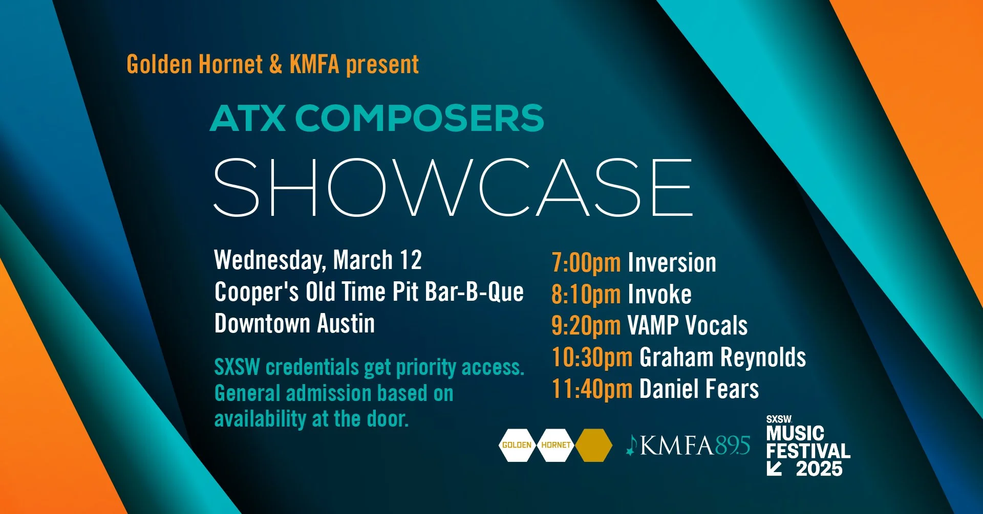 Mar 12 SXSW ATX Composers Showcase Wednesday, March 12, 2025 7:00 PM 10:00 PM Google Calendar ICS View Event →